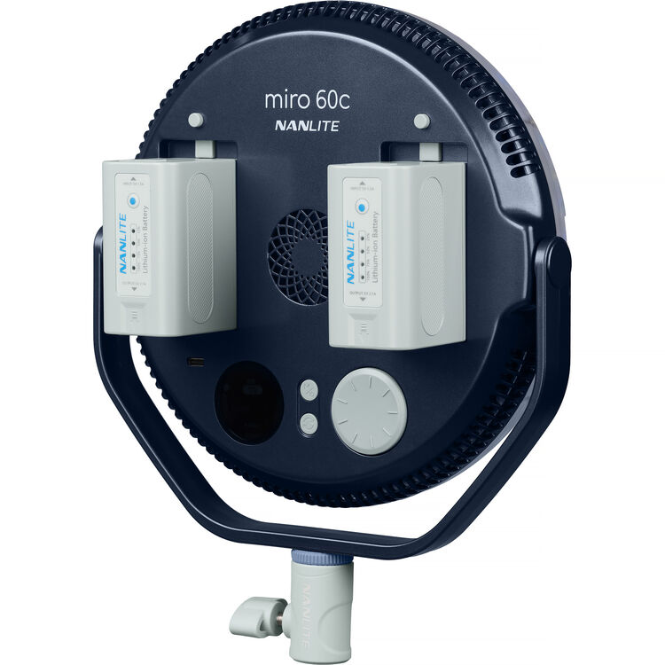 Miro 60c može raditi neprekidno putem mrežnog napajanja koristeći priloženi USB-C kabl, uz odgovarajući adapter. Takođe postoji mogućnost korišćenja opcionih NP-F750 ili NP-F970 baterija, kao i USB-C spoljašnjih baterija. Nanlite nudi dodatnu opremu koja zadržava elegantan izgled uređaja, poput baterija u usklađenim bojama, punjača za dve baterije ili praktične trake za pričvršćivanje spoljne baterije uz kućište svetla. Sa dve NP-F750 baterije (5200 mAh) miro 60c može raditi oko 1 sat i 3 minuta, dok sa dve NP-F970 baterije (7800 mAh) autonomija iznosi oko 1 sat i 38 minuta.