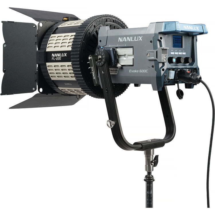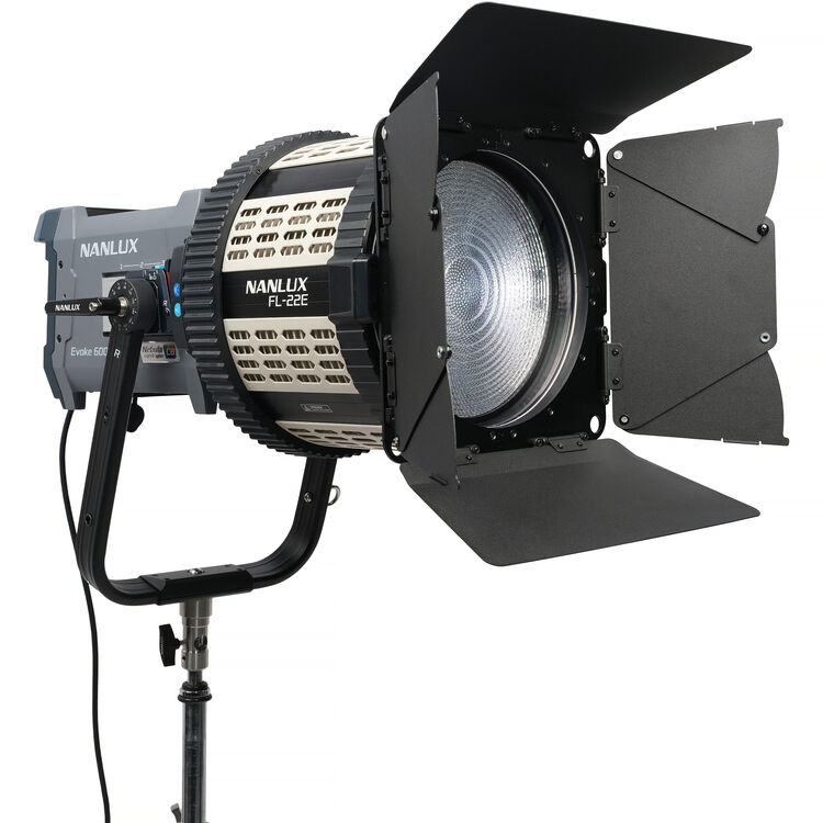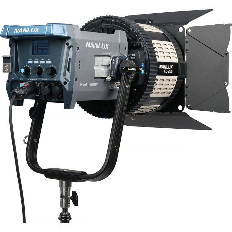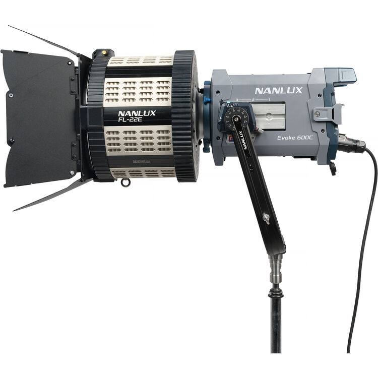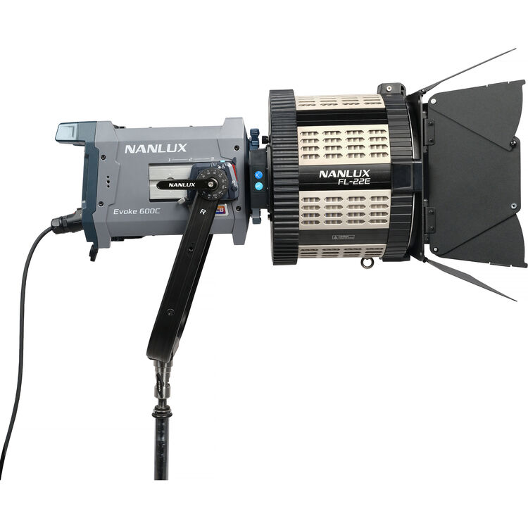 Višenamenski dodatak za posebno dostupni Nanlux Evoke 600C, model FL-22E BE Mount motorizovano Fresnel sočivo nudi promenljivi zum opseg od 15° do 48°.