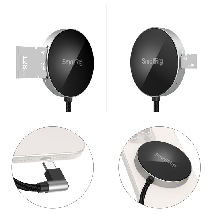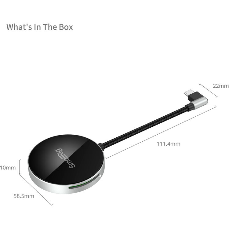 SD 3.0 Card Reader kompanije SmallRig je visokobrzinski čitač kartica dizajniran da se praktično magnetno pričvrsti na smartphone, tablet ili laptop, omogućavajući brzo prenosenje podataka i smanjenje vremena zastoja tokom snimanja. Poseduje površinu za montažu kompatibilnu sa MagSafe-om, kao i ugrađeni USB-C kabl sa konektorom pod pravim uglom koji ne ometa rad. Ovaj elegantni čitač kartica ima brzinu prenosa do 104 MB/s i može preneti 1 GB podataka za samo 10 sekundi.
