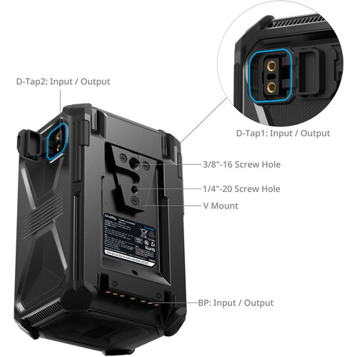 Dva D-Tap porta, dva USB-C porta, jedan USB-A i dva DC izlaza omogućavaju istovremeno napajanje i punjenje više uređaja zahvaljujući nezavisnim električnim kolima. USB-C portovi podržavaju brzo punjenje od 100W, a ugrađeni BMS kontrolni čip omogućava potpuno punjenje baterije za samo dva sata. Dodatni 1/4″-20 i 3/8″-16 navoji nude fleksibilne opcije montaže, dok indikator sa pozadinskim osvetljenjem olakšava upotrebu čak i u uslovima slabog osvetljenja.